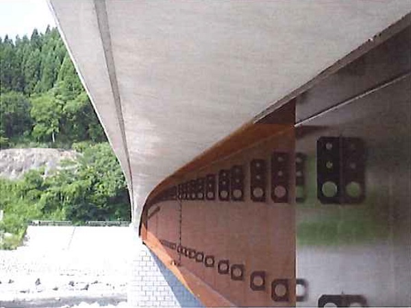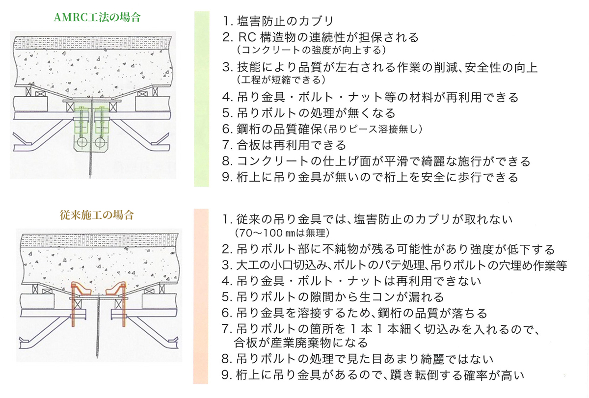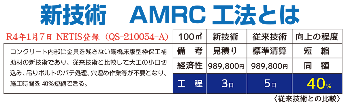 コンクリートの内部に金具を残さない鋼橋床版型枠支保工補助材の新技術であり、従来技術と比較して大工の小口切込み、吊りボルトのパテ処理、穴埋め作業等が不要となり、施工時間を40%短縮できる。